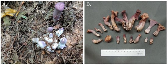 Fruiting bodies of G. purpuraceus. (A) Habitat. (B) Basidiomata.