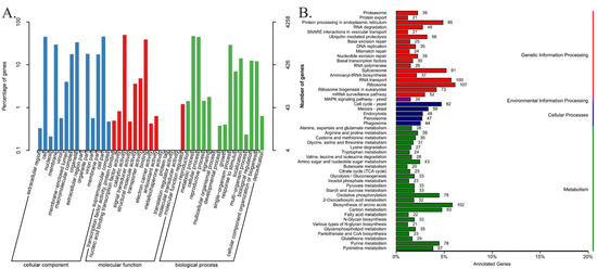 The mainly functional annotation of the G. purpuraceus genome. (A) Gene Ontology (GO) functional annotation; (B) Kyoto Encyclopedia of Genes and Genomes (KEGG) functional annotation.