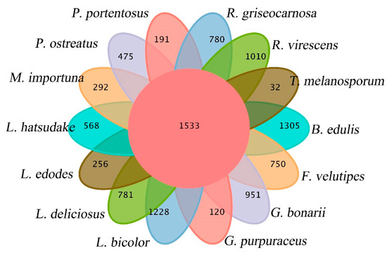 The gene families of G. purpuraceus, L. bicolor, L. deliciosus, L. hatsudake, R. griseocarnosa, R. virescens, G. bonarii, B. edulis, T. melanosporum, L. edodes, F. velutipes, P. ostreatus, M. importuna and P. portentosus were subjected to cluster analysis. The Venn diagram of common and unique gene families among 14 fungi is shown in Figure 5. The numbers of total genes, total gene families and cluster genes are listed in Table 2. A total of 22,569 gene families from 14 species were obtained by OrthoMCL. There were 6590 gene families found in the G. purpuraceus genome, of which 1533 were core orthologous gene families among 14 fungi genomes and 120 were unique gene families found in G. purpuraceus (Figure 5). Among these genomes, the number of common gene families with single-copy genes was 573.