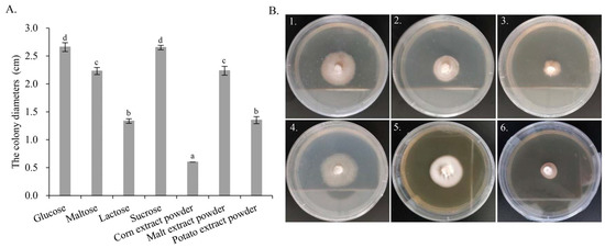 From the genome annotation results, G. purpuraceus exhibited a limited ability to degrade lignocellulose. Comparative genomics analysis showed that the gene families associated with starch and sucrose metabolism were abundant, which is similar to P. Portentosus. Therefore, seven different carbon sources were further screened to find the most suitable culture medium for food fermentation and strain propagation. Measurements of the colony diameter, the growth parameter and morphology of G. purpuraceus are shown in Figure 7. From the colony diameter (Figure 7A), the fastest growth of G. purpuraceus is glucose, reaching 2.66 cm, followed by sucrose (2.65 cm), malt extract powder (2.24 cm), maltose (2.23 cm), potato extract powder (1.35 cm) and lactose (1.34 cm). It is confusing that G. purpuraceus cannot utilize the corn extract powder, where the colony diameter still showed the original 0.6 cm. The results showed that sucrose and maltose were efficiently utilized by G. purpuraceus, except for lactose. In the medium added with potato and corn extract powder containing a lot of starch, the ability of G. purpuraceus to utilize starch was not as efficient as P. Portentosus [70]. As for colony diameter, the utilization of sucrose by G. purpuraceus was comparable to that of glucose, and there was no significant difference between them (p > 0.05). The utilization of maltose or malt extract powder was second only to glucose and sucrose, with a significant difference (p < 0.01). In addition, the morphology of G. purpuraceus in malt extract powder exhibited denser mycelium and healthy growth (Figure 7B-5). The colony diameters and morphology of G. purpuraceus cultured on different carbon sources provided a reference for the selection of cheap carbon sources for the large-scale production of strains, such as sugarcane juice usually used in yeast fermentation.