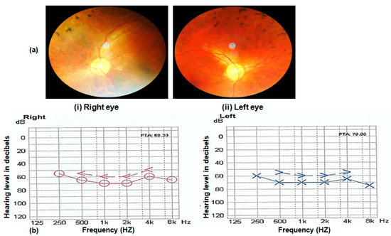 - Ng, T.K.; Tang, W.; Cao, Y.; Chen, S.; Zheng, Y.; Xiao, X.; Chen, H. Whole exome sequencing identifies novel USH2A mutations and confirms Usher syndrome 2 diagnosis in Chinese retinitis pigmentosa patients. Sci. Rep. 2019, 9, 5628. [Google Scholar] [CrossRef]