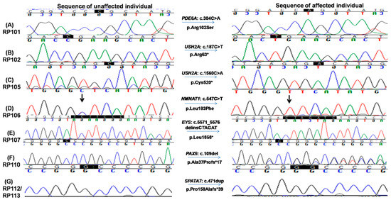 Chromatograms of known and novel disease causing variants (single nucleotide substitution/s, deletion, duplication and small INDELs) identified in this study, i.e., (A) c.304C>A in RP101, the homozygous sequence is shown on the left and homozygous mutated on the right (proband III.IV), (B) c.187C>T in RP102 showing homozygous normal on the left side and homozygous mutated on the right (proband IV.I) and (C) c.1560C>A in RP105 the homozygous wild-type sequence is shown on the left, whereas homozygous mutated on the right side (proband V.IV). (D) c.547C>T in RP106, homozygous mutated sequence is shown on the right, while homozygous normal sequence is present on the left (proband V.II); (E) c.5571_5576delinsCTAGAT in RP107 is shown on the right, whereas the sequence of normal individuals is shown on the left side; (F) c.109del in RP110 showing heterozygous mutated sequence on the right while wild-type sequence is shown on the left; and (G) c.471dup in RP112 and RP113, heterozygous mutated sequence is shown on the right, while normal sequence is on the left side.