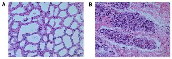 Blocks of mammary gland tissue were fixed in 4% paraformaldehyde for 48 h and processed and embedded into paraffin blocks using routine procedures [25]. The tissues were embedded in paraffin blocks, and sections of 3–6 μm were cut from each specimen. Oven-dried sections were deparaffinized with xylene, dehydrated through a graded series of ethanol (100%, 95%, and 80% ethanol) and distilled water, and stained with hematoxylin and eosin. Hematoxylin–eosin-stained sections were analyzed using a light microscope (Leica DM4 B, Wetzlar, Germany) equipped with a Leica DFC7000 T digital camera utilizing the Leica Application Suite X imaging software (Leica Biosystems, Wetzlar, Germany).