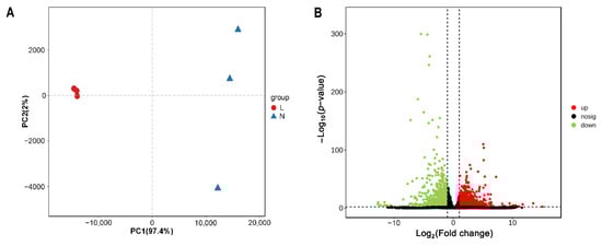 Differential gene expression analysis between L and N groups determined by RNA-seq. (A) Principal component analysis (PCA) of differentially expressed (DE) mRNAs. (B) Volcano plot of DE mRNAs in jenny mammary glands between L and N groups. The upregulated and downregulated DE mRNAs are indicated by red and green dots, respectively, while the DE mRNAs with no significant difference in the two groups are indicated by black dots. L, lactating mammary glands of jennies; N, nonlactating mammary glands of jennies.