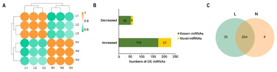 Differential miRNA expression analysis between the L and N groups by miRNA-seq. (A) Sample correlation heatmap of miRNAs. (B) The histogram shows the number of differentially expressed (DE) miRNAs identified in jenny mammary glands in the L and N groups. (C) Venn diagram representation of the common and group-specific DE miRNAs identified in jenny mammary glands of the L and N groups. L, lactating mammary glands of jennies; N, nonlactating mammary glands of jennies.