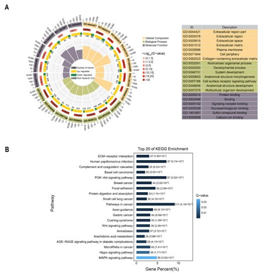 The 3144 DE mRNAs were related to 340 KEGG pathways (Table S3B); the top 20 significantly enriched pathways are shown in Figure 4B. The most prevalent pathways associated with DE mRNAs were associated with ECM-receptor interaction, the PI3K-Akt signaling pathway, breast cancer, complement and coagulation cascades, protein digestion and absorption, and arachidonic acid metabolism.