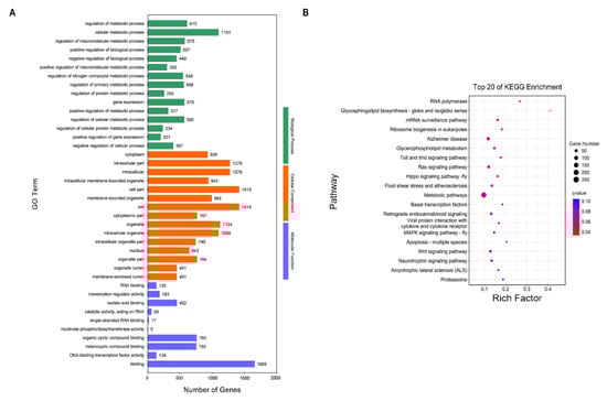 According to the differential gene test results, a functional enrichment analysis was performed on gene ontology (GO) terms in the molecular function (MF), cellular component (CC), and biological process (BP) categories (http://www.geneontology.org/) (accessed on 15 January 2022). Through a comparison with the Kyoto Encyclopedia of Genes and Genomes (KEGG) database (http://www.genome.jp/kegg/) (accessed on 15 January 2022), pathways that were significantly enriched in DE mRNAs were identified. GO and KEGG analyses were performed with DAVID 6.8 (https://david.ncifcrf.gov/) (accessed on 20 January 2022) and KOBAS 3.0 (http://kobas.cbi.pku.edu.cn/genelist/) (accessed on 20 January 2022) using R based on the hypergeometric distribution. The GO and KEGG pathway enrichment statistics were performed using Fisher’s exact test with a cut-off q value < 0.05 considered as significant for both GO terms and pathways.