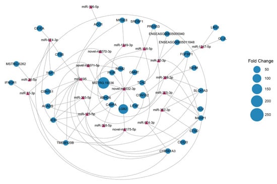 Integrated miRNA-target negative correlation regulatory network. The differentially expressed miRNAs are displayed as red triangles, and the target mRNAs are shown as blue circles. The sizes of blue circles indicate the fold changes in the lactating period compared to the nonlactating period.