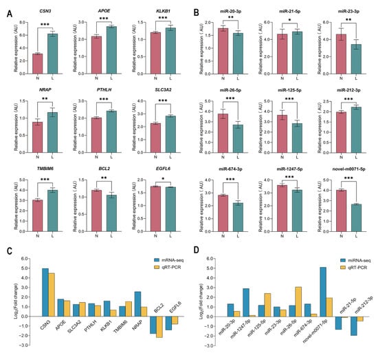 Verification of DE mRNAs and DE miRNAs by qRT-PCR. (A) qRT-PCR analysis of nine randomly selected mRNAs. Data represent the means ± SD. (B) qRT-PCR analysis of nine randomly selected miRNAs. Data represent the means ± SD. (C) Comparison of mRNA expression in terms of Log2 (fold change) as assessed by mRNA sequencing and qRT-PCR. (D) Comparison of miRNA expression in terms of the Log2 (fold change) as assessed by miRNA sequencing and qRT-PCR. L, lactating mammary glands of jennies; N, nonlactating mammary glands of jennies. * p < 0.05; ** p < 0.01; *** p < 0.001.