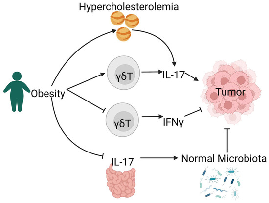 Recent studies on IL-17 have started to link its function with both metabolic disorders and cancer. IL-17 may promote tumor development following disrupted metabolism in one of the following three ways: (1) obesity enhances tumor development by promoting IL-17 production from γδ T cells within the tumor environment. At the same time, the production of anti-tumor IFN-γ by γδ T cells is reduced; (2) hypercholesteremia induces higher levels of IL-17 in the serum and promotes tumor growth; (3) obesity disrupts IL-17-mediated regulation on intestinal microbiota, which results in glucose intolerance and insulin resistance, which are also linked to increased risk in cancer development.