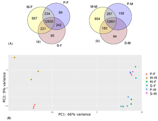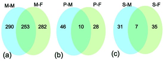 Distribution of uniquely expressed genes in each adipose tissue in male and female reindeer. (a) Shared and uniquely expressed genes in the metacarpal adipose tissue of male (M-M) and female (M-F) samples, (b) shared and uniquely expressed genes in the perirenal tissue of male (P-M) and female (P-F) samples, and (c) shared and uniquely expressed genes in the scapular tissue of male (S-M) and female (S-F) samples.