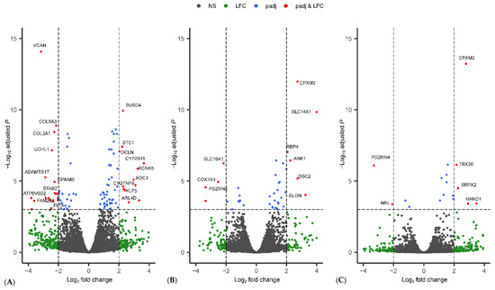 Volcano plot of genes that were expressed in the (A) metacarpal adipose tissue, (B) perirenal adipose tissue, and (C) prescapular adipose tissue. Significantly differentially expressed genes are marked with their gene names. For the complete list of differentially expressed genes, please see Tables S4–S6. In figure, NS = non-significant; LFC = absolute Log2 fold change greater than 2; padj = adjusted p value less than 0.001; and padj and LFC represent genes that fulfil the criteria of threshold for LFC and padj.