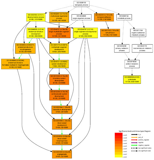 From the list of 225 significantly DEGs identified in the M-F vs. M-M comparison (Table S4), 59 genes did not have GO annotations. The GO analysis results of the upregulated genes in male metacarpal tissue (n = 108 with GO annotation) revealed 31 significantly enriched GO terms, whereas those upregulated in female samples (n = 58 with GO annotation) resulted only one GO term ‘Oxidoreductase activity, acting on paired donors, with incorporation or reduction of molecular oxygen’ (Table S7). The upregulated genes in males were significantly enriched in 18 biological processes, 10 molecular functions and 3 cellular component categories (Table S7). Out of the 18 biological processes, 9 GO terms were associated with developmental processes, such as ‘circulatory system development’, ‘cardiovascular system development’, ‘blood vessel development’, ‘vasculature development’, and ‘anatomical structure development’ (Figure 4). Moreover, the biological process GO terms, ‘cell adhesion’, ‘angiogenesis’, ‘blood vessel morphogenesis’, and ‘anatomical structure formation involved in morphogenesis’ were also significantly enriched in the upregulated DEGs in male metacarpal tissue.