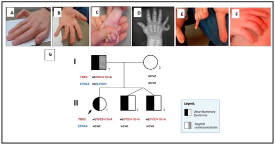 Ulnar-mammary syndrome (UMS, OMIM #181450) is an autosomal dominant disorder with considerable phenotypic heterogeneity that ranges from dorsalization of the little finger [1] to complete absence of the forearm but classically presents as posterior upper limb deficiencies (ulnar ray). The clinical spectrum includes apocrine gland malformations and dysfunction, dental anomalies, delayed puberty, abnormal external genitalia in males, imperforate hymen in females, ventricular septal defects, arrhythmias, subglottic stenosis, pyloric stenosis, and anal atresia or stenosis [2,3,4,5,6]. Approximately 128 cases of UMS have been published in the literature [Orphanet Home Page. Available online: https://www.orpha.net/consor/cgi-bin/Disease_Search.php?Ing=EN&data_id=2808&Disease_Search_diseaseGroup=Ulnar-mammary-syndrome&Disease_Disease_Search_diseaseType=Pat&Disease(s)/group/group%20of%20diseases=Ulnar-mammary-syndrome&title=Ulnar-mammary%20syndrome&search=Disease_Search_Simple (accessed on 31 August 2022)]. UMS has been postulated to be caused by haploinsufficiency in the T-Box 3 gene (TBX3, OMIM * 601621) [2,3,4,6,7], although alternative mechanisms, such as nonsense-mediated mRNA decay [8] and dominant negative effects [5,9], have been proposed.