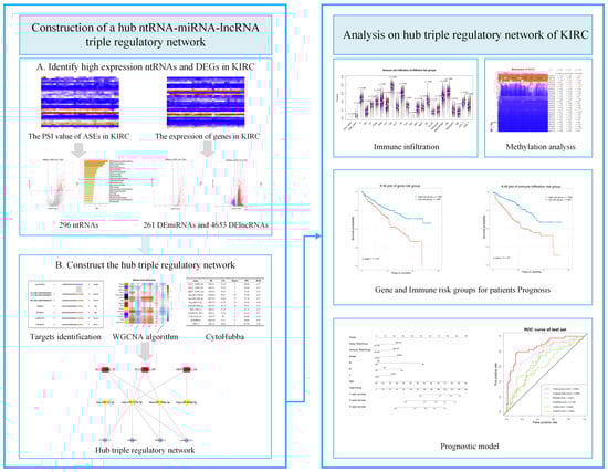 The following supporting information can be downloaded at: https://www.mdpi.com/article/10.3390/genes13091656/s1, Figure S1: Triple regulatory network in KIRC. Red squares indicate HEntRNAs, yellow V-shapes indicate DEmiRNAs, and blue circles indicate DElncRNAs; Figure S2: Analysis of the scale-free index for various soft-threshold powers β in WGCNA; Figure S3: (A) Cross-validation plot for gene LASSO Cox model tuning parameter selection and profiles of LASSO coefficients for 11 genes in the network hub triple regulatory network. (B) Cross-validation plot for immune LASSO Cox model tuning parameter selection and profiles of LASSO coefficients for eight immune cells; Figure S4: KM plot (high-Riskscoregene vs. low-Riskscoregene groups) for KIRC patients; Figure S5: 55 enrichment Gene Ontology (GO) and pathways of 263 genes containing HEntRNA, including 33 GO biological processes, nine reactome pathways, seven KEGC pathways, five WikiPathways, and one CORUM pathway; Figure S6: Gene–drug network for genes in the hub triple regulatory network; Figure S7: Extended hub triple regulatory network with drug information; Figure S8: ROC curve comparison with other studies in KIRP dataset; Table S1: List of 533 KIRC samples; Table S2: List of 72 normal samples; Table S3: List of 296 HEntRNAs; Table S4: ntRNA–miRNA interaction pairs from TargetScan database; Table S5: miRNA–lncRNA interaction pairs from LncBase2 database; Table S6: Core genes obtained by cytoHubba’s five methods; Table S7: Correlation between ABAT methylation probes and ABAT_33905_AP expression in KIRC.