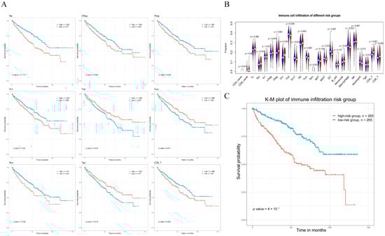 Analysis related to immune infiltration. (A) KM curves of immune cells (high-immune cell abundance vs. low-immune cell abundance) that significantly associated with OS. (B) Violin plot of 24 immune cells abundance between high-Riskscoregene group (red) and low-Riskscoregene one (blue), and p < 0.05 showed a significant difference between the two groups in immune cell expression. (C) KM plot (high-Riskscoreimmune vs. low-Riskscoreimmune groups) for KIRC patients.