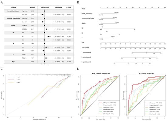 To further explore the impact of our genes and immune cells on the prognosis of KIRC patients, we performed a multivariate Cox regression analysis. Our model included gene expression, patient characteristics, and immune infiltration at the same time, and the ROC curve of the model in the training set (AUC = 0.808) and test set (AUC = 0.863) achieves the best performance in comparison with other studies [,,,,]. Moreover, few other models take into account the impact of gene expression, patient characteristics, and immune infection on patient prognosis at the same time, which may help to increase the model’s robustness.