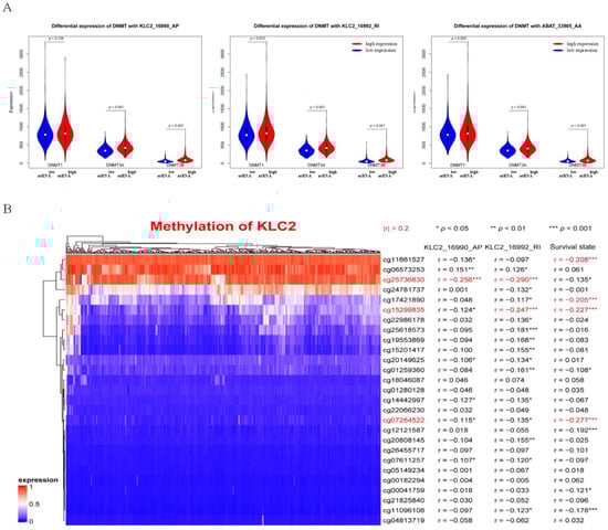 Analysis of ntRNA methylation. (A) Differential expression of three DNA methyltransferases (DNMT1, DNMT3A, and DNMT3B) with three ntRNAs (KLC2_16990_AP, KLC2_16992_RI, and ABAT_33905_AP). (B) Heatmap of methylation probes of KLC2.