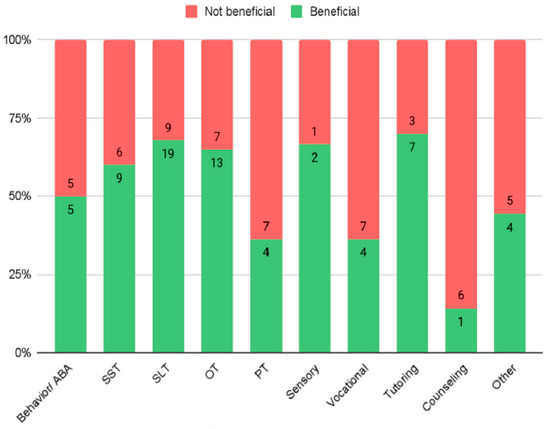 The list of services parents reported their children with FXS obtained is in Table 2. Data were analyzed using responses from parents of children who received each service, with parents responding per service. By comparing the proportion of responses of “helpful” to that of the responses of “unhelpful” and neutral combined (Figure 1), parents reported the most helpful services were tutoring (n = 7, 70%), speech and language therapy (n = 19, 68%), sensory integration therapy (n = 2, 67%), and occupational therapy (n = 13, 65%). The perceived least helpful services were physical therapy (n = 4, 36%), vocational training (n = 4, 36%), and counseling (n = 1, 14%). When comparing parent reports for services based on their delivery method mid-pandemic, in-person services had the highest rate of satisfaction (n = 44, 76%), followed by hybrid (n = 11, 46%), and then online services (n = 16, 40%). Satisfaction with hybrid and online services was not significantly different. All services decreased in frequency per week, except for vocational training, which increased. However, none of the changes in frequency were found to be statistically significant.
