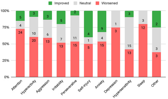 Parents reported their child’s behavior change from prior to the pandemic to the time of response. The reported improvements in behavior were compared against the reported worsening of behavior for each (Figure 2). Responses of “no change” were not included in these calculations. The highest proportions of improvement were reported in self injury (n = 4, 40%) and anxiety (n = 9, 32%). However, both of these percentages were still below half of the children who were reported to have each behavior. The highest proportions of worsening were reported in sleep problems (n = 12, 80%), depression (n = 3, 75%), and attention problems (n = 24, 73%).
