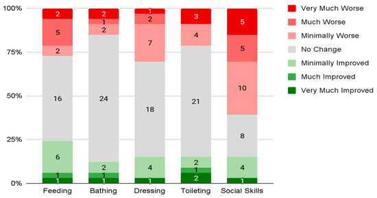 Parents reported their child’s daily living skill change from prior to the pandemic to the time of response. The mean overall reported change in daily living skills ( = 2.6, s = 1.14) fell between “mildly decreased” and “stayed the same”. Parents also reported changes in each of five skills (Figure 3). Parents reported the most significant “decline” in social skills (n = 20, 61%) and reported the most significant “improvement” in feeding (n = 8, 24%). The skills with the least reports of “decline” were bathing (n = 5, 15%) and toileting (n = 7, 12%). However, a majority of parents reported no change across all five social skills.