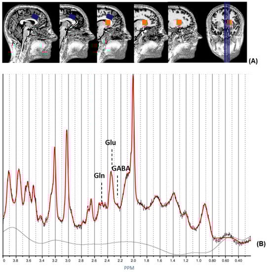 1H magnetic resonance spectroscopy (MRS) voxel placement and 1H-MRS spectrum. (A) Sagittal and coronal views of MRS voxels displayed on a single subject’s T1 structural image. The blue lines in the coronal view (far-right image) indicate the locations of the sagittal views from left to right. The orange box indicates the location of the voxel in the striatum. The blue box indicates the location of the voxel in the ACC. (B) Example of an ACC spectrum from a healthy control acquired by LCModel. Reprinted from [21]. Abbreviations: ACC, anterior cingulate cortex; GABA, y-aminobutyric acid; Gln, glutamine; Glu, glutamate; PPM, parts per million.