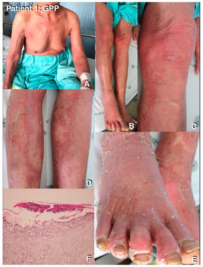 A 70-year-old Karen tribe woman had presented with non-follicular pustules on erythrodermic skin of her trunk and extremities since the age of 50. Nail psoriasis was also observed (Figure 1A–D,F). She had episodes approximately once a year. Diagnosis of GPP with erythroderma was made. No specific environmental or dietary triggers were noted. The rashes were well-controlled with rotational methotrexate and oral acitretin treatment. A skin biopsy from pustules on her abdomen showed subcorneal and spongiform pustules (Figure 1E).