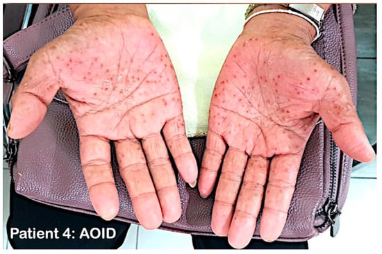 Patient 4 with AOID with pustular skin reaction. Discrete non-follicular sterile pustules on both palms one week after they first appeared.