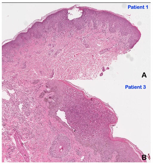 Histological analysis of skin biopsies from patients 1 and 3 revealed notable pathology. In patient 1 with GPP, lesional skin histology revealed sub-corneal and intra-epidermal collections of neutrophils. Neutrophil microabscesses were observed in the stratum spinulosum and stratum corneum on a background of marked acanthosis and elongated rete ridges. Similar neutrophil-rich macroscopic pustules were noted underneath the stratum corneum in patient 3 (AOID), along with epidermal acanthosis, elongation of rete ridges, and inflammatory infiltrate (Figure 5).