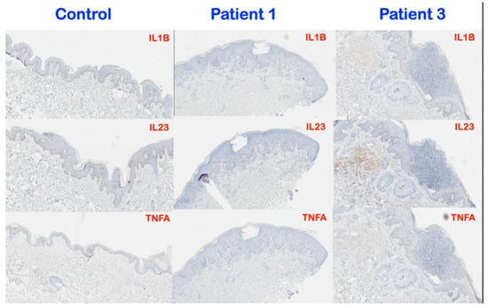 Representative images of immunohistochemistry for IL1B, IL23, and TNFA in the normal skin tissue, patient 1 (GPP), and patient 3 (AOID). IL1B and IL23 showed mildly increased expression in dermis of patient 3 whereas no difference between patient 1 and normal skin tissue. No significant difference of TNFA expression between normal skin tissue and patients 1 and 3 (Magnification, 8×).