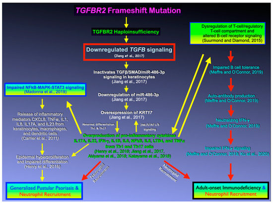 Hypothetical flowchart showing genetic pathways as a result of TGFBR2 mutation. Downregulation of TGFβ signaling as a result of TGFBR2 mutation leads to downregulation of the microRNA, miR-486-3p, overexpression of KRT17, over-production of pro-inflammatory cytokines, impaired NFkB-MAPK-STAT signaling, dysregulation of T-cells and B-cells and subsequent GPP and AOID with neutrophil recruitment [,,,,,,,,].