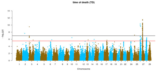 where Y is a vector of phenotypes (TD and BS), β is the vector of fixed effects (tank as fixed effect and body weight measured at the end of the experiment as covariate), is a vector of random additive polygenic genetic effects with distribution ∼N(0, ), where is the additive genetic variance and G is the genomic relationship matrix (GRM) calculated using the imputed genotypes [61], e is the vector of residuals with distribution ∼N(0, ), where I is the identity matrix, and is the residual variance, and X and Z are the incidence matrices for fixed and random effects, respectively. The allelic substitution effect and p-value for each SNP were also estimated using the GCTA.