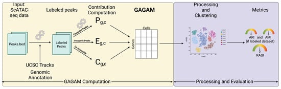 Workflow for computation and evaluation of GAGAM. The workflow starts with scATAC-seq data, and labels the peaks with the help of genomic annotations and UCSC tracks. Then it computes the three contributions forming GAGAM. GAGAM is evaluated and compared to other GAMs through clustering experiments with three well-established metrics: ARI [29], and AMI [30] (if the dataset is labeled) or RAGI [31] (if the dataset is not labeled).