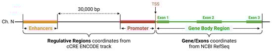 - UCSC. UCSC Human cCRE Track Download. Available online: http://hgdownload.soe.ucsc.edu/gbdb/hg38/encode3/ccre/ (accessed on 29 December 2022).