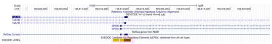 Genomic region of TMLHE and SPRY3 genes. In this case, the promoter signature (red) is an ambiguous position between the two divergent genes, and due to some overlapping, the prom peaks could be assigned to the wrong genes.