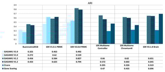 Figure 7 and Figure 8 show the results of RAGI computation, assessing the information content of the GAMs (GAGAM1 v1.2, GAGAM2 v1.2, GAGAM1 v1.0, GAGAM2 v1.0, Cicero and GeneScoring GAMs, respectively) compared to other clustering classifications. Following the same logic from ARI and AMI results presentation (see Section 4.5.2), the two versions of GAGAM v1.2 are shown with patterned bars, the two versions of GAGAM v1.0 from [10] in lighter blue tones for the three Old datasets (left), and Cicero and GeneScoring are shown in darker blue tones for the three New datasets (right). To perform RAGI computation (as described in Section 4.2.2), this work employed three different sets of curated marker genes, one for each type of tissue in the datasets (human PBMC, human bone marrow, mouse brain) and two different sets of housekeeping genes, one for each species in the datasets (human and mouse, respectively).