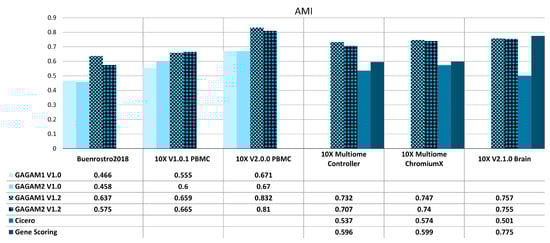 This work relies on the ARI [29] and AMI [30] metrics from information theory to measure similarity in classification results. These two metrics are often employed for this type of evaluation. In particular, ref [31] uses them for benchmarking, and they are the metrics employed to evaluate GAGAM v1.0 [10], which supports the direct comparison of the new results with those previously produced. ARI and AMI similarity measures range between 0 and 1, where 1 is a perfect match, and 0 is complete dissimilarity. The main difference between the two is that ARI performs better when the ground truth clustering has large clusters with equal cell numerosity. In contrast, AMI performs better when the ground truth clustering yields unbalanced clusters in size, including small clusters [41]. Considering this, even though AMI is preferable for most cases considered in this work, the results rely on both metrics.
