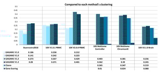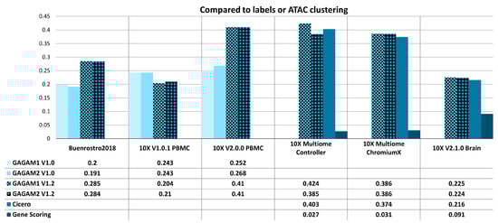 This work analyzes GAGAM v1.2 performance on six datasets (see Table 1 and Table 2). Three of these datasets supported the validation of GAGAM v1.0 [10]; the others are new. Five out of six datasets are from the 10XGenomic platform [24] since it provides high-quality datasets generated by various technologies. The datasets shared with [10] consist of a collection of respectively 5335 (10X v1.0.1 PBMC [48]) and 4623 (10X V2.0.0 PBMC [49]) cells from human Peripheral Blood Mononuclear Cells (PBMC) samples. Additionally, this study also employed the dataset of bone marrow (Buenrostro2018) from [50], consisting of 2034 cells with provided cell-type classification. The three new datasets consist of one scATAC-seq dataset of mouse brain with 7729 cells (10X V2.1.0 Brain [51]), and two from the single cell Multiome technology, consisting respectively of 10,691 cells (10X Multiome Controller PBMC [52]) and 10,970 cells (10X Multiome Chromium X PBMC [52]) from human PBMC samples. These two datasets provide scATAC-seq and scRNA-seq data, supporting the preliminary comparison between the activity and expression of genes. None of the three new datasets have cell labels. Therefore, their ARI and AMI evaluations leverage raw scATAC-seq clustering-based labels.