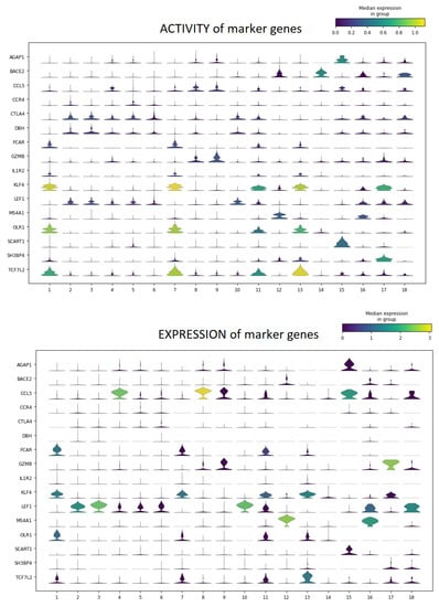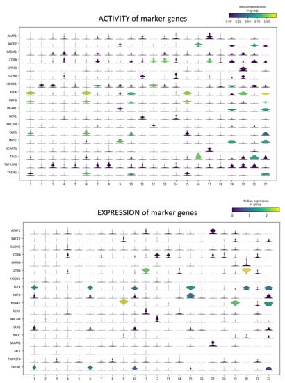 Finally, the proposed validation strategy aims to support the comparison between epigenomic and transcriptomic data for multi-omics studies. As discussed, multi-omics datasets allow for comparing the GAGAM results with the scRNA-seq data. This work proposes a preliminary qualitative comparison between the activity and expression of DA genes identified by GAGAM v1.2 and scRNA-seq clustering analysis. At first, this process performs differential analysis on the GAGAM v1.2 clustering. This yields the most DA genes for each cluster. Then, to investigate if the activity and the expression of specific genes are consistent, it provides two types of visualizations: violin plots and a heatmap, showing the activity and the expression levels of the most DA genes. It is possible to investigate if the activity and the expression of specific genes are consistent.