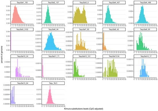 Nucleotide divergence of satDNA families in T. aquitania ranged between 0.14% (TaquSat5-3102) and 21.69% (TaquSat14-17). Altogether, the satellitome of T. aquitania shows a mean nucleotide divergence value of 13.07% (Table 1). Additionally, we calculated the tandem structure index (TSI) of each satDNA [31]. This index represents the proportion of internal reads of satDNA arrays (reads containing only satDNA sequence) with respect to the total of reads with satDNA sequence. The TSI varies between 0 and 1 and informs about the clusterization level of the satDNA family. Therefore, dispersed families with arrays formed by a low number of repeat units would present a lower value of TSI in comparison to families with their repeat units concentrated in longer arrays, which would present TSI values closer to 1. The satDNAs of T. aquitania have a TSI mean of 0.53. The first six most abundant satDNAs (including the telomeric) have the highest TSI values, ranging between 0.99 for TaquSat5-3102 and 0.76 for TaquSat3-6. However, in satDNA families with large monomer sizes, high values of the TSI index could be related more to the size than the structure since short reads used in that calculation could correspond to the same monomers and not to tandem monomers. The remaining ones have the lowest TSI values ranging between 0.53 for TaquSat6-84 and 0.00 for TaquSat15-64.
