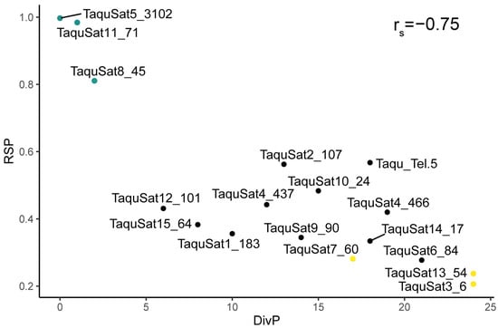 Figure 2. Correlation between the homogenization (RSP) and degeneration (DivP) indices of T. aquitania satDNA families. Recently expanded families are in blue and highly divergent and degenerated families are in yellow.