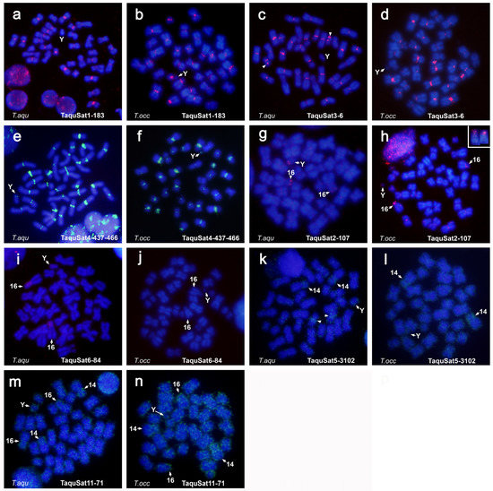 SatDNA TaquSat5-3102 is distributed along all the chromosomes in both species, with enrichment on heterochromatin regions of pair 14, the centromeric region of some pairs, and on the Y chromosome; however, is not accumulated on the heterochromatin region of pair 16 (Figure 3k,l). The satDNA TaquSat11-71 is also distributed in both species along all the chromosomes, with enrichment on heterochromatin short arms of pairs 14 and 16, and on the Y chromosome (Figure 3m,n). Hence, the heterochromatic short arm of pairs 14 and 16 on both species shared satellite sequences, as the TaquSat2-107 and TaquSat5-3102, but also present different compositions on sequences, such as TaquSat6-84 and TaquSat5-3102.
