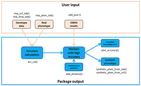 In our previous work [12], we developed a new strategy for leveraging both low-density genotype and resequenced data for CM discovery through the “Synthetic phenotype association study” (SPAS). This approach subsidizes missing phenotype information of publicly available resequenced soybean datasets by a high-accuracy, low-density genotype marker that is used as a synthetic phenotype in GWAS. Whilst SPAS reveals the landscape of association for genomic variants and phenotypes; accuracy serves as a measure of direct correspondence between every variant position and phenotype. Therefore, SPAS, empowered by accuracy calculation, extends the analysis beyond a threshold of statistical significance of a fitting model used for GWAS, limits the number of false negatives [12], and thus overcomes some of the GWAS limitations [8]. For soybean, we introduced a web-based AccuTool for a reference diversity panel of resequenced soybean accessions (Soy775) that automatically calculates the accuracy for 35.7 M curated variant positions [12] that are publicly available via SoyKB [13]. To extend this accuracy calculation for other soybean genotype datasets with more or different variant positions, to make accuracy calculation more effective for disproportional phenotype datasets, and, also, to enable SP2CM for other species, we developed AccuCalc as a Python-based package. In comparison to AccuTool, the AccuCalc package presented in this work contains all previously described functions and options related to accuracy calculation and, further, is empowered by additional accuracy types that are more suitable for disproportional data. AccuCalc is enriched by synthetic phenotype formatting from user-provided genotype and genome-localized association study (GLAS) visualization. AccuCalc is GWAS fitting model-independent since it uses GWAS results provided by a user as input. The AccuCalc package design accepts either variant calling format (vcf) or HapMap (hmp) genotype format and can be used for any species. AccuCalc offers the ability to extend the use of whole genome sequence data that are becoming more available from previous and new studies [13,14,15].
