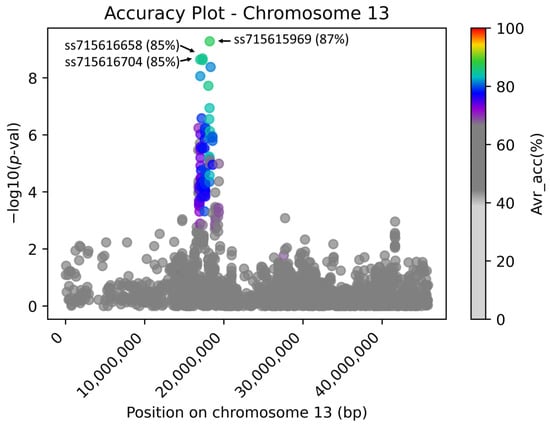 The AccuCalc chromosome-wise view of the associated region with flower color on chromosome 13 accentuated with calculated accuracy. The Manhattan plot for soybean data (SoySNP50K chip genomic data and purple/white flower color phenotype data) with average accuracy to the causative mutation-associated SNP on chromosome 13 at position 17,316,756. In this example, the markers with the highest accuracy (shown for the three top points in parentheses) are also the markers with the highest −log10 (p-values).
