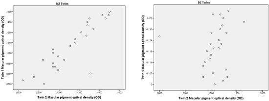 The MPODs for twin 1 versus twin 2 for the mean MPOD values are shown in Figure 1. The intrapair correlations of the MPOD in both eyes in the twin pairs were significantly higher in MZ twin pairs compared with DZ twin pairs, proving that genetic factors are more responsible for macular pigment density (83–86%) compared to environmental factors (14–17%).