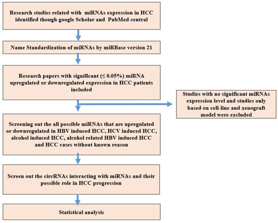 The present study was categorized into five parts, each with its own goal: (1) To screen out upregulated and downregulated miRNAs in HBV-induced HCC reported studied through data mining; (2) to screen out upregulated and downregulated miRNAs in HCV-induced HCC reported studied through literature mining; (3) to isolate the upregulated and downregulated miRNAs in alcohol-induced HCC reported studied through data retrieval; (4) to isolate all possible upregulated and downregulated miRNAs causing HCC reported that have been studied through literature mining; and (5) to screen out the circRNAs interacting with miRNAs and their possible role in HCC progression as reported and studied through data retrieval. Strict criteria were used to screen out only those miRNA showing statistically significant (less than 0.05 was considered significant) expression in HCC reported in the included studies. The methodology followed in this study is presented in Figure 1.