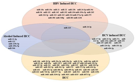 Among them we screened miRNAs that were common among HBV-induced HCC, HCV-induced HCC and alcohol-induced HCC. We observed that miR-223 was commonly expressed in HCC-induced HBV, HCV and alcohol-induced HCC. However, miR-223 was downregulated in HBV and HCV-induced HCC but was significantly upregulated in alcoholism-related HCC. The dysregulation of miR-24-3p has been reported in HBV-induced HCC and HCV-induced HCC. Though, miR-24-3p was upregulated in HBV-induced HCC but downregulated in HCV-induced HCC.