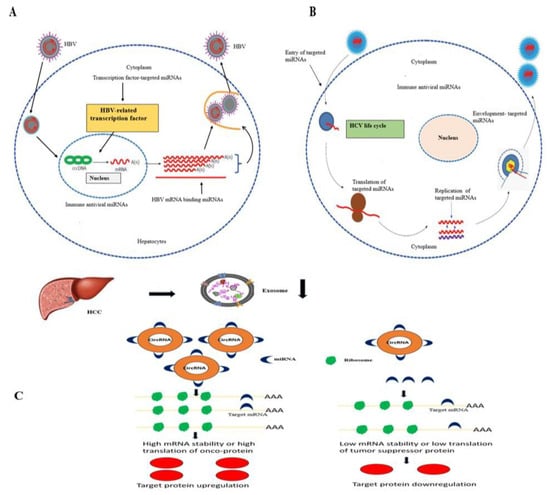 miRNAs and circRNAs involved in HBV and HCV-induced HCC. (A) miRNAs involved in the replication of HBV by targeting transcription factors, direct targeting viral mRNAs and regulating immune response. (B) miRNAs are involved in the replication of HBV via targeting viral entry, translocation, replication, envelopment and regulating of the immune response. (C) CircRNA crosstalk with miRNA in HCC.