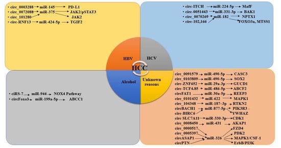 Hepatocellular carcinoma (HCC) is a type of malignant tumor. miRNAs are noncoding RNAs and their differential expression patterns are observed in HCC-induced by alcoholism, HBV and HCV infections. By acting as a competing endogenous RNA (ceRNA), circRNA regulates the miRNA function, indirectly controlling the gene expression and leading to HCC progression. In the present study, data mining was performed to screen out all miRNAs and circRNA involved in alcohol, HBV or HCV-induced HCC with statistically significant (≤0.05%) expression levels reported in various studies. Further, the interaction of miRNAs and circRNA was also investigated to explore their role in HCC due to various causative agents. Together, these study data provide a deeper understanding of the circRNA–miRNA regulatory mechanisms in HCC. These screened circRNA, miRNA and their interactions can be used as prognostic biomarkers or therapeutic targets for the treatment of HCC.