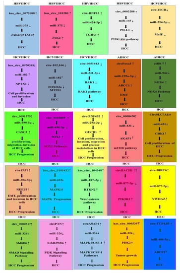 Most of the HCC-related studies did not represent any particular causative agent of HCC and reported the significant interaction of and their effect on causing circRNA–miRNA HCC. In the present study, we have included all 15 studies reporting on the interaction of circRNA–miRNA and their possible role in inducing HCC (Figure 6).